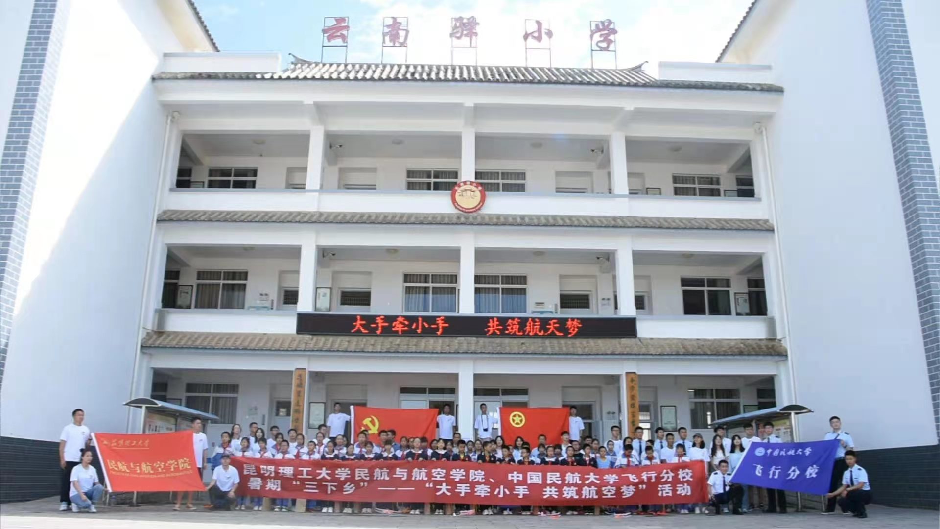 “我爱祖国的蓝天,晴空万里,阳光灿烂,白云为我铺大道,东风送我飞向前……”。全体队员与云南驿小学师生在《我爱祖国的蓝天》熟悉的旋律中,共同深情表达对蓝天的热爱与深情,表达对祖国大好河山的深深眷恋。