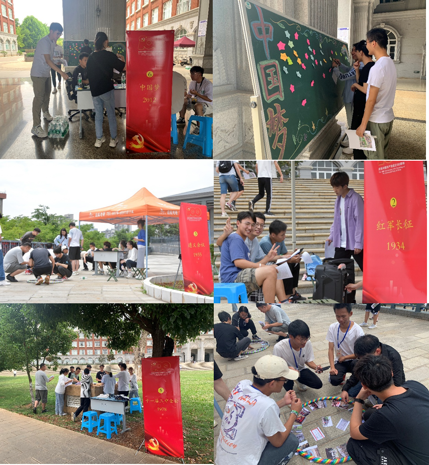 活动围绕百年党史中重要历史事件设置了中国共产党第一次全国代表大会、红军长征、遵义会议、新中国成立、十一届三中全会、中国梦、十九届五中全会等8个打卡点,每个打卡点根据党史设置打卡任务,包括唱红歌、红影会、诗歌诵读、知识匹配、看图学党史、我的中国梦、知识问答等形式。参赛学生在起点领取闯关地图,按照地图指示前往打卡地点,在每个打卡点完成指定党史学习任务进行认证,最终按照认证成功的数量以及所用时长计算最终成绩。活动中,大家热情高涨,活力十足,随着最后一名参赛选手完成打卡,本次活动顺利结束,同学们在活动打卡点纷纷合影发朋友圈留念。