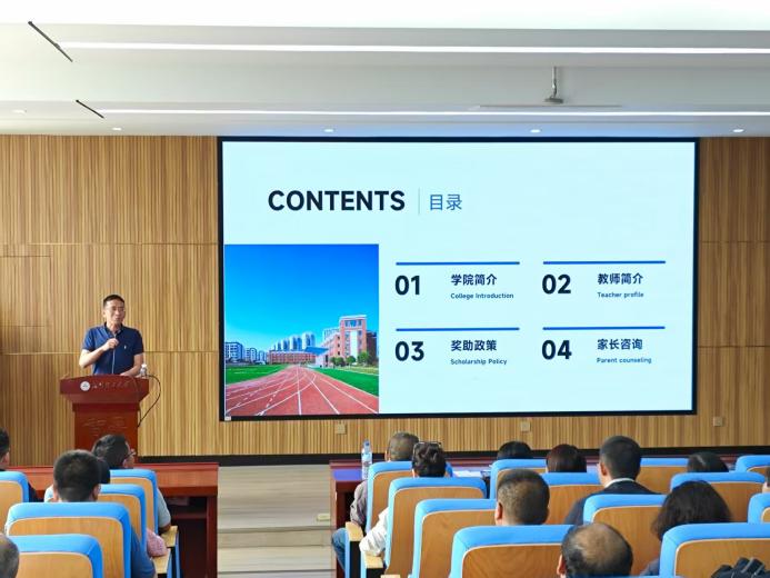 新生班主任:严荣老师、徐凯老师、朱颖墨老师,新生辅导员李倩老师,介绍了2025级新生的基本情况及学院教育管理服务体系,就专业方向、奖助学金政策等家长普遍关心的问题进行解答。