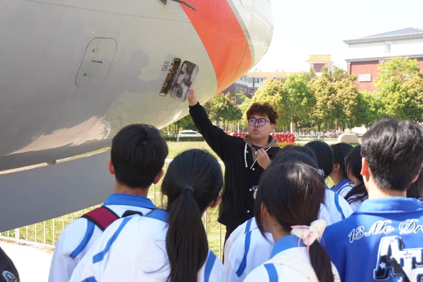 随后,师生们前往公教楼前的波音737“智华号”教学训练基地,近距离接触这架从民航运输航线上退役的波音737-300型客机。讲解员为同学们逐一讲解空速管、起落架、发动机、襟缝翼等外部关键部件的功能,帮助同学们快速建立对飞机整体结构的认知。在工作人员的引导下,同学们有序登上飞机,先后参观驾驶舱、客舱等核心区域,亲手触摸驾驶杆、仪表等设施,直观感受飞机操控逻辑与客舱设计细节,真切体会航空工业的硬核实力。