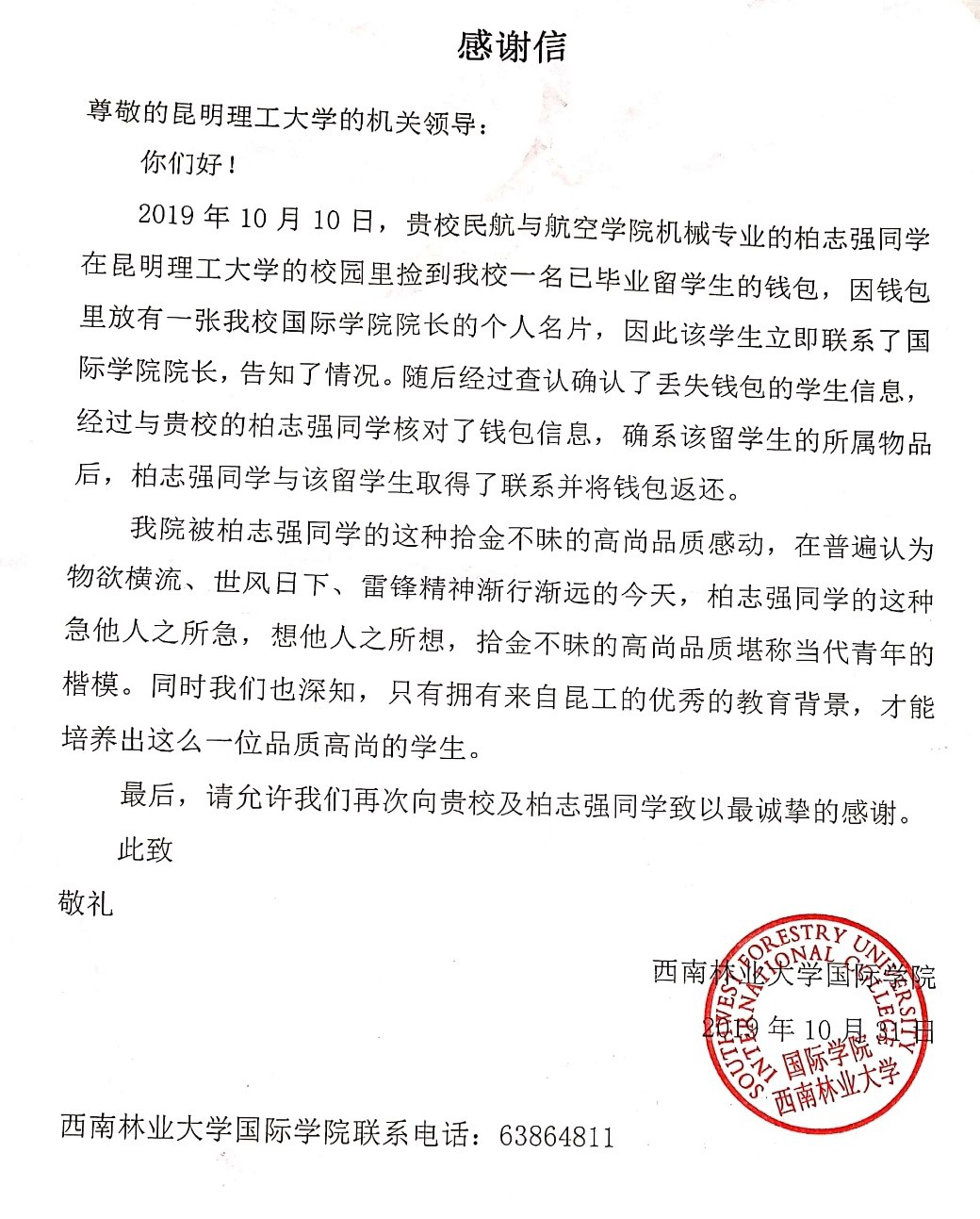 拾金不昧是中华民族的传统美德,是高尚道德情操的体现,也是党员践行初心使命的具体体现。近日,炸金花app下载 收到来自西南林业大学国际学院的一封《感谢信》,信中大力称赞2016级学生柏志强拾金不昧的高尚品质。