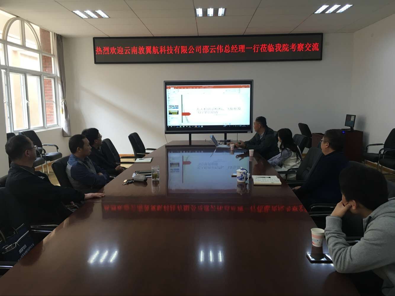 2016年9月29日上午,云南敦翼航服科技有限公司总经理邵云伟一行到航空学院参观并洽谈合作事宜,校办主任潘金军陪同参观。航空学院党委副书记赵耕、副院长沈颖刚、刘增力出席洽谈会。