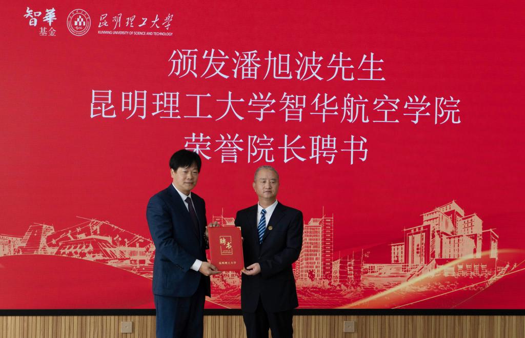 唐家华向潘旭波颁发昆明理工大学智华航空学院荣誉院长聘书。