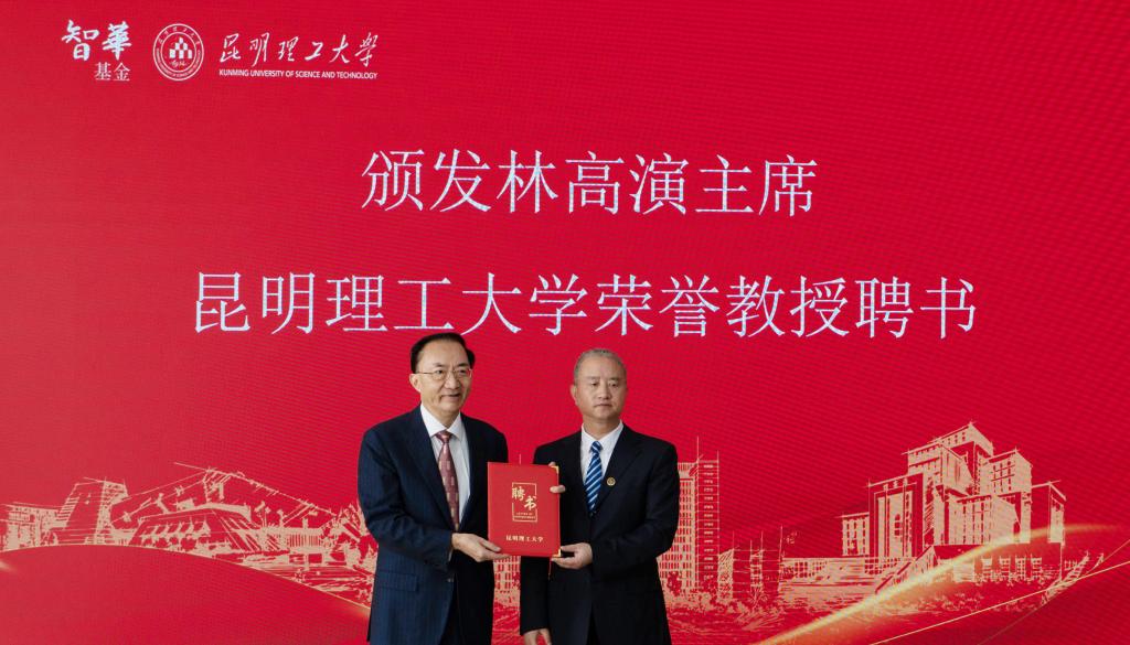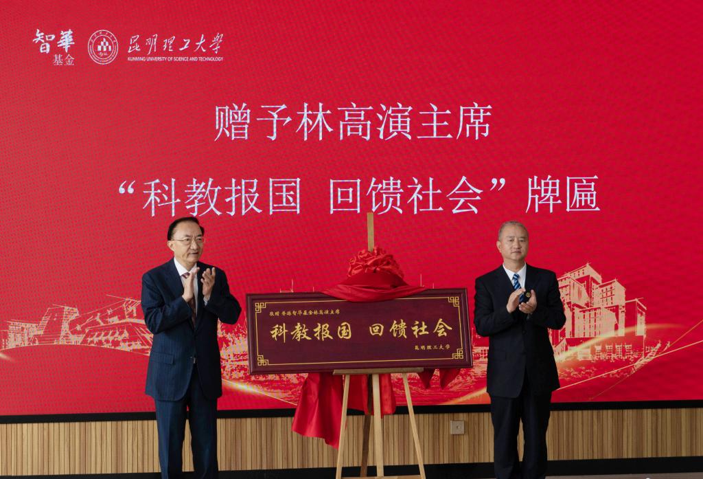 唐家华向林高演主席颁发昆明理工大学荣誉教授聘书并赠予“科教报国 回馈社会”牌匾。