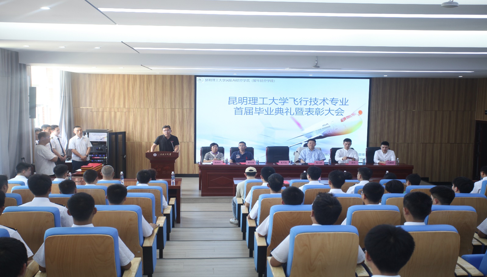 6月21日下午,炸金花app下载 在公教楼344报告厅举行飞行技术专业首届毕业典礼暨表彰大会。学院党政领导、飞行系和科室负责人、飞行技术专业全体在校学生和毕业生、辅导员,以及毕业生家长代表共计150余人参加。